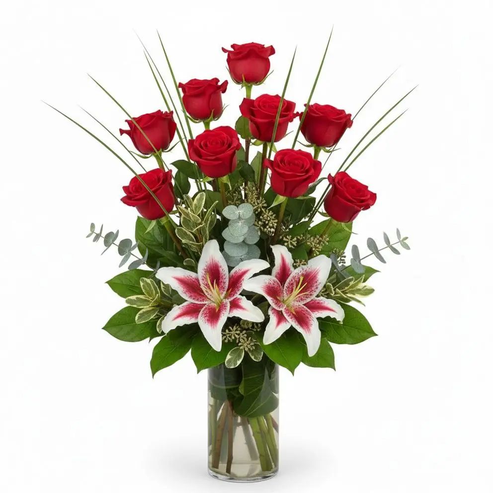 Celebrate life's precious moments with the captivating Ruby Radiance. Six vibrant red roses perfectly complement a graceful lily, surrounded by lush greenery. This stunning arrangement radiates warmth and joy, making it an unforgettable gift.